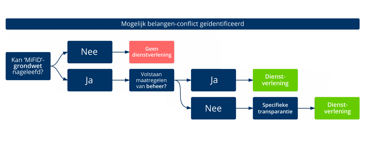 De wettelijke regeling omtrent belangenconflicten is een aanvulling op de algemene MiFID-grondwet. Deze grondwet wordt door ons bedrijf geëerbiedigd door zich loyaal, billijk en professioneel in te zetten voor de belangen van de klant bij het verlenen van diensten van verzekeringsbemiddeling.