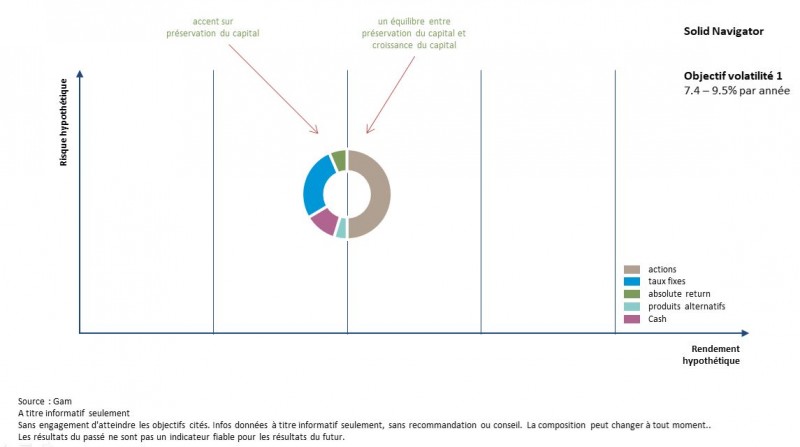 Solid Navigator est composé de 25% Gam Star Defensive, 25% Gam Star Cautious, 25% Gam Star Balanced et de 25% Gam Star Growth.