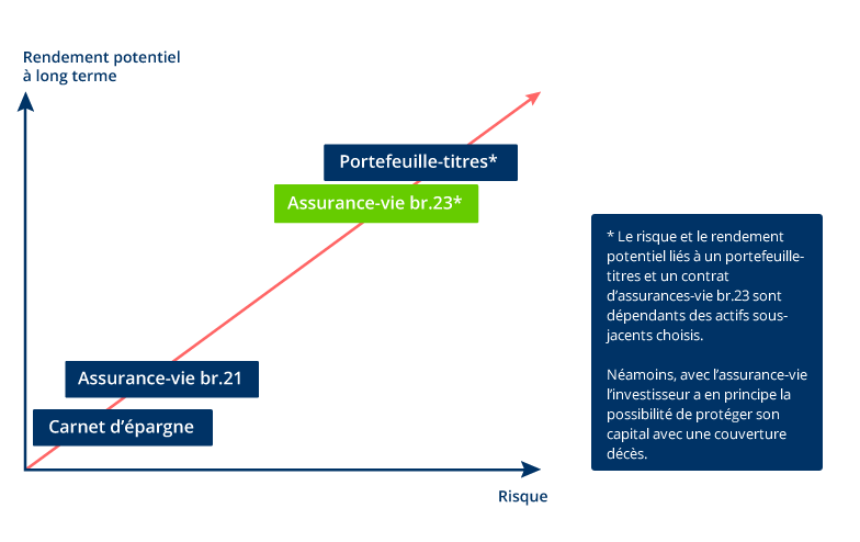 Bien plus qu’un simple produit d’investissement, l’assurance-vie en branche 23 est un réel outil de planification financière permettant de transmettre son patrimoine, avec une garantie décès en sus. Une taxe aux assurances de 2% sur votre mise est compensée par la capacité de reprendre vos avoirs qui, dès le premier jour, sont exempts de précompte mobilier. Le précompte mobilier est de 27% et monte à 30% en 2017. Ainsi le produit se profile comme une alternative valable pour vos comptes d'épargne et comptes à terme. La nature d'impôt initial unique de la taxe aux assurances vous prémunit aussi des effets d'augmentations futures du taux du précompte mobilier. Il n'y a pas de taxe boursière lors de transactions, ni de taxe sur les comptes titres.